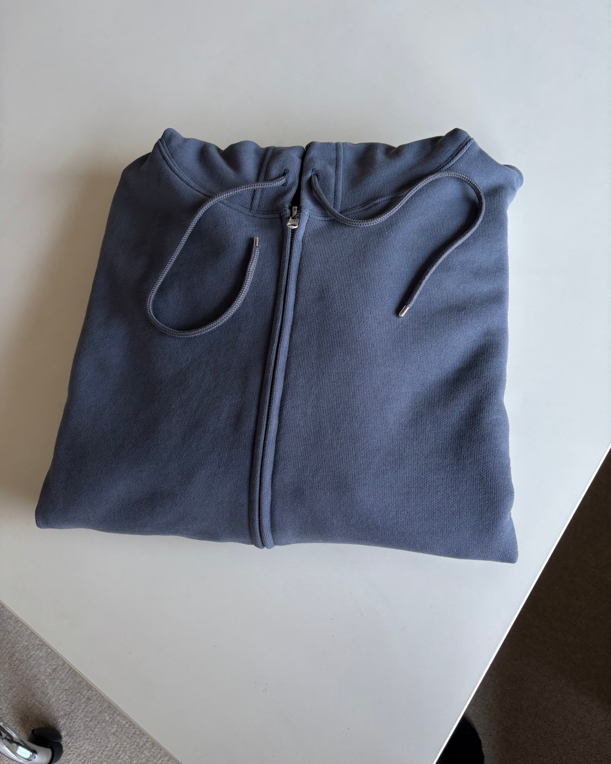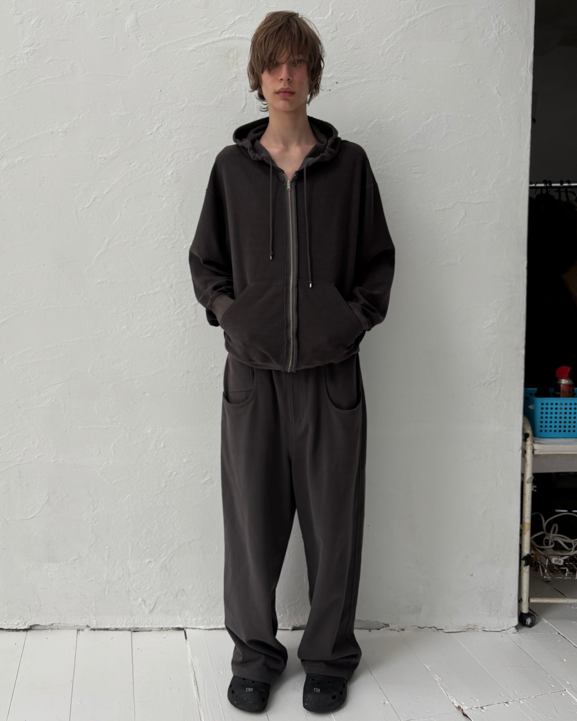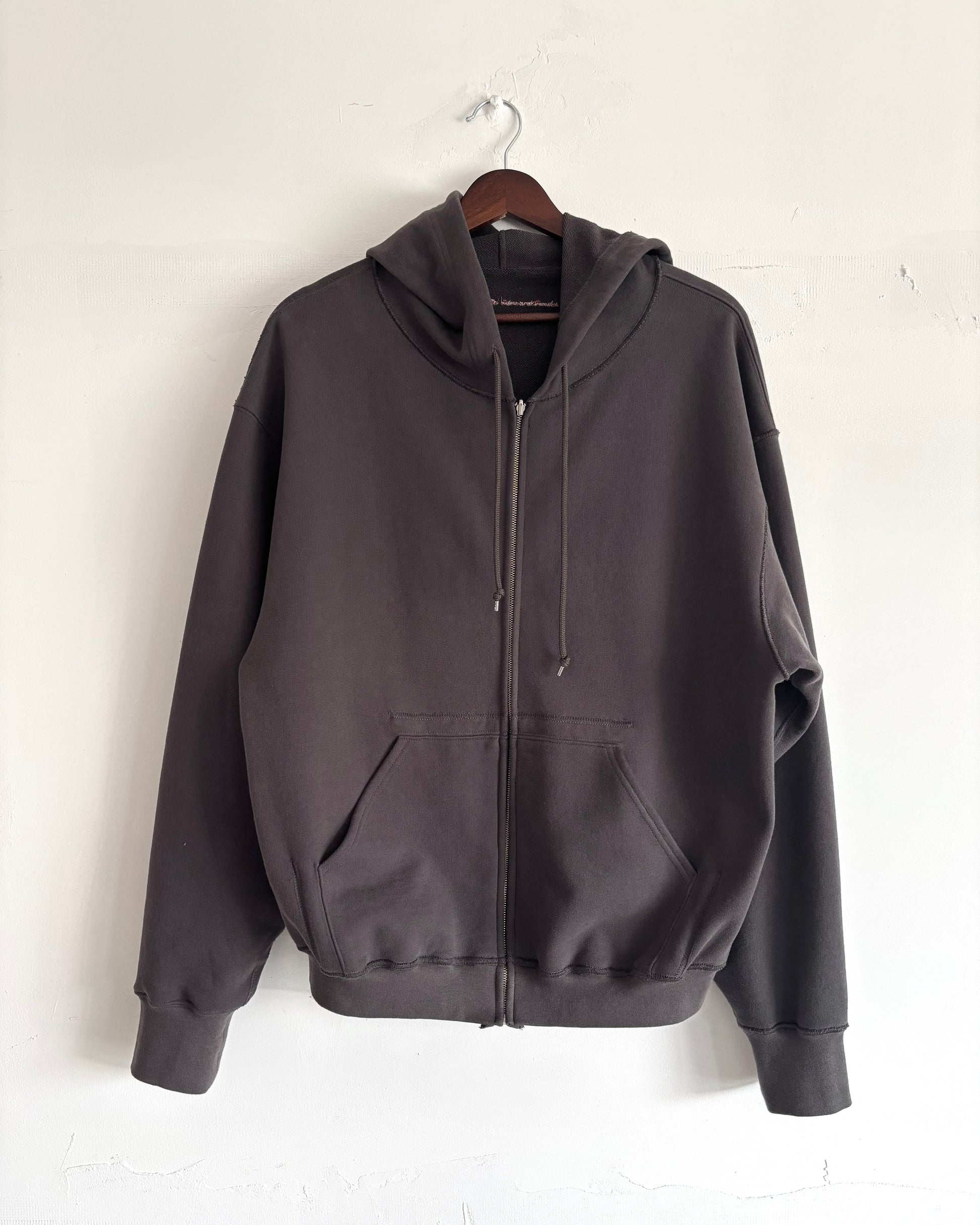 縫い代が左右で反転するように縫製し、服の裏と表のバランスを出来るだけ均等にし裏表の概念を曖昧にしたジップアップフーディ