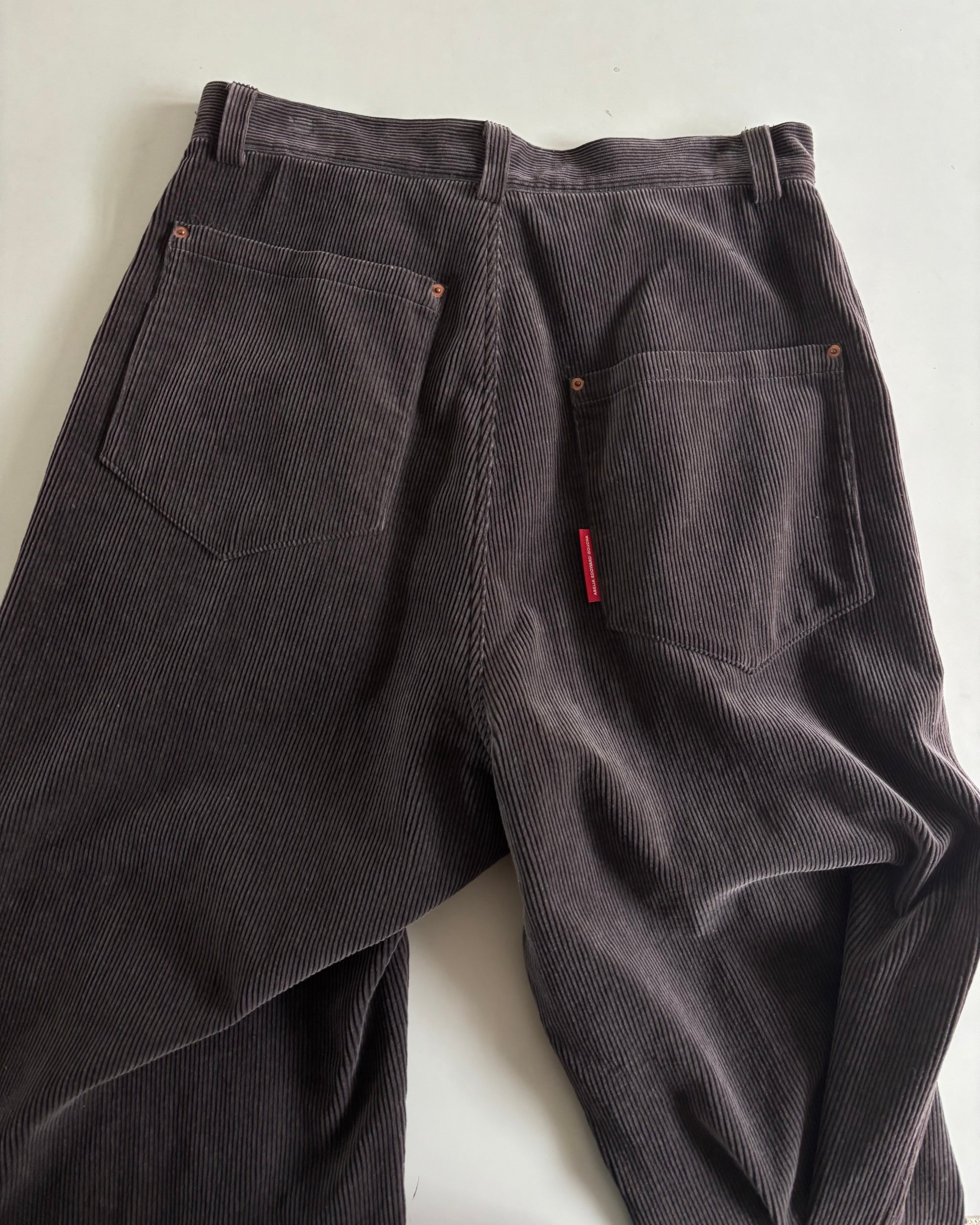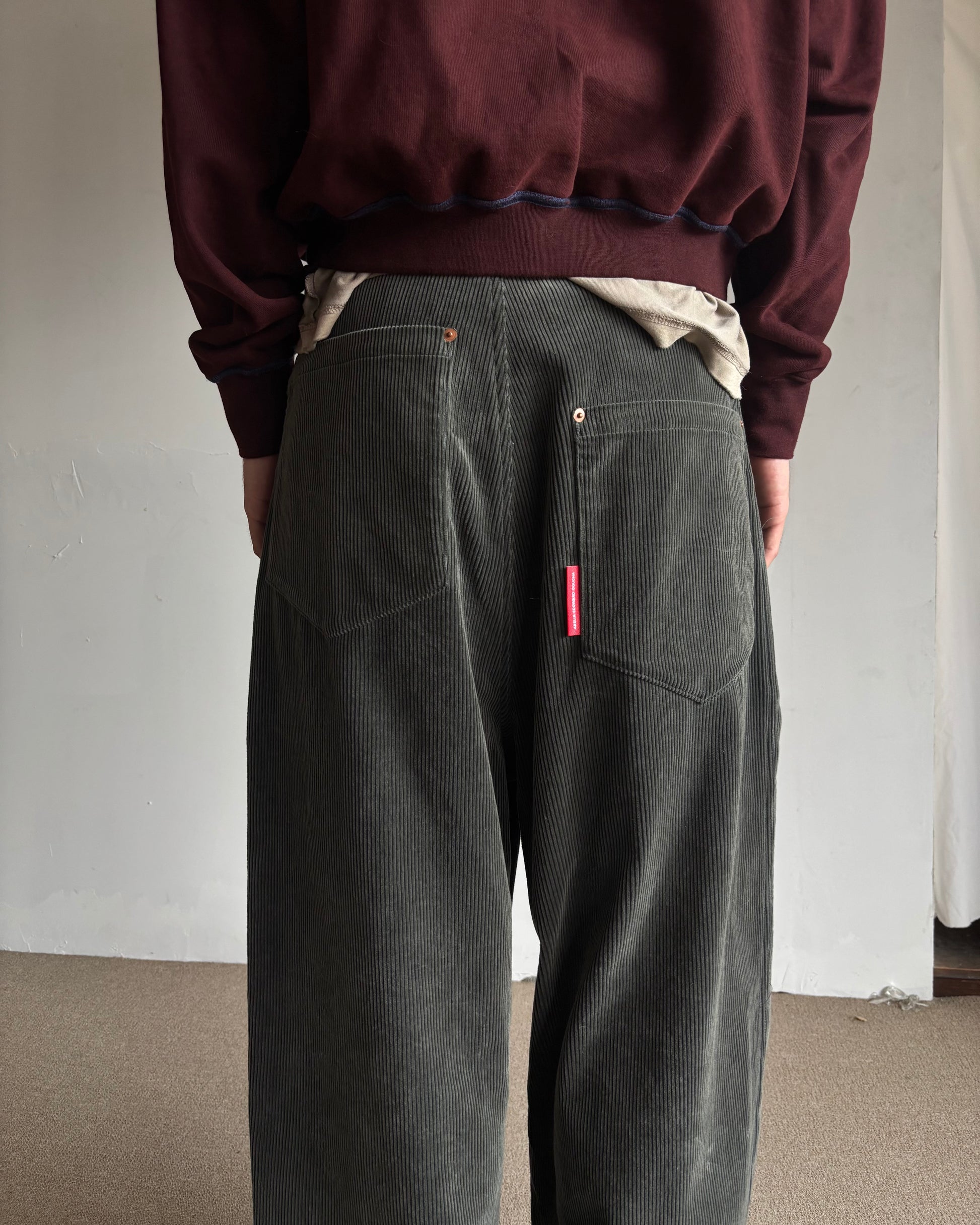 股上、ポケット位置が深く作られたワイドパンツ。腰パンしているようなダボっとしたシルエットで、ウエストを折り返すとポケットがちょうど良い高さになります。後ろのポケットは通常通り履く場合と、折り返した時とどちらでも使えるよう左右で高さを変えています。