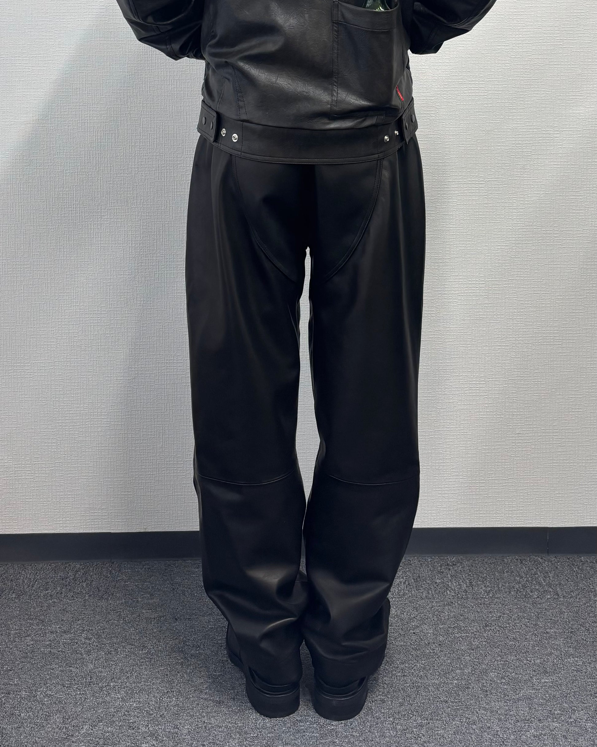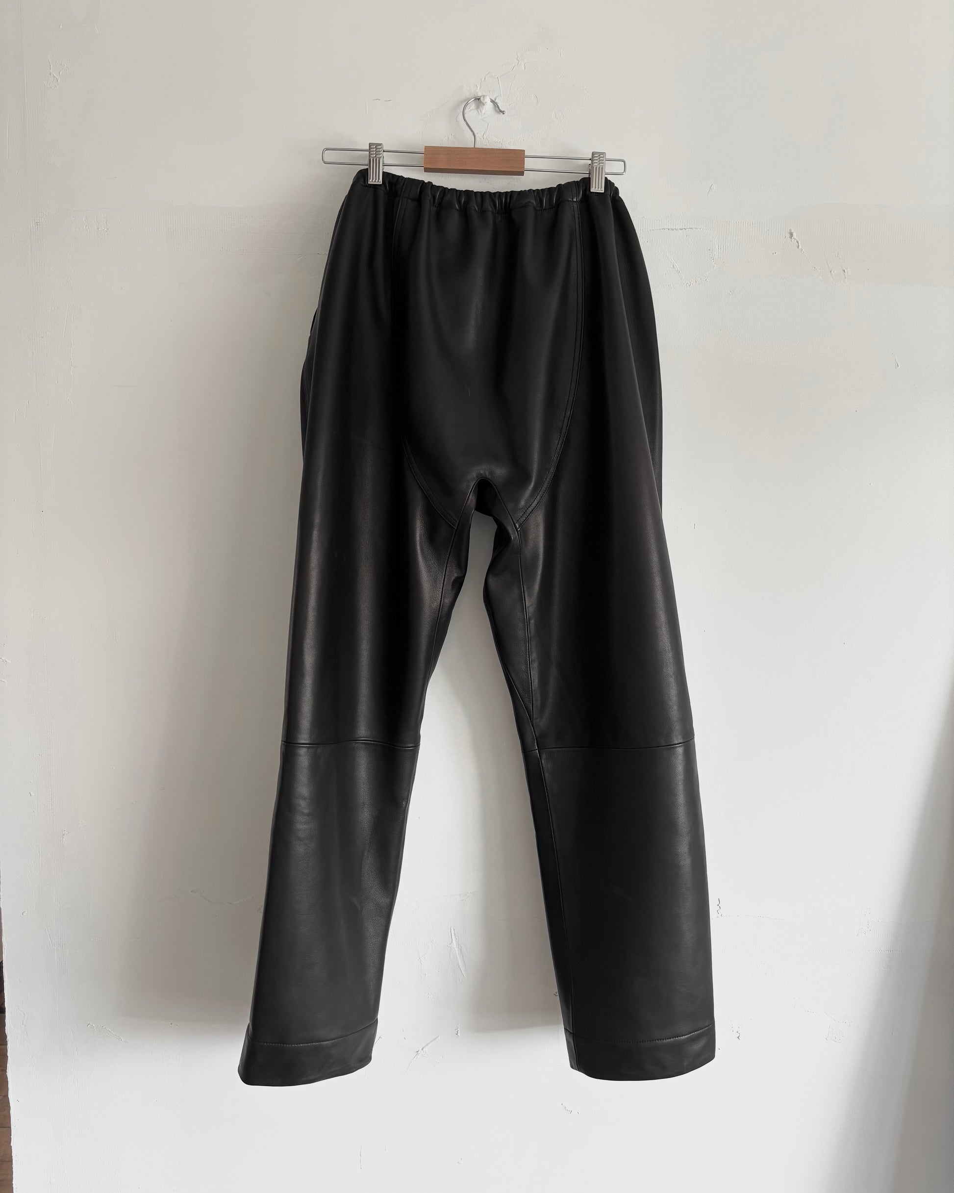 トランクスをそのまま長く仕立てたようなラムレザーバイカーパンツ。テーパードシルエットで、後ろは3面構造でマチを付けることでトランクス特有のディテールを再現しました。ウエストにドローコード、フロントポケットを配置し、リラックス感と機能性を両立したデザインです。